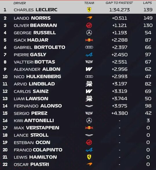 Antroji bandymų diena liko monakiečio Charleso Leclerco žinioje. Itališkosios „Ferrari” ekipos lenktynininkas buvo greičiausias, aplenkdamas „McLaren” pilotą Lando Norrisą bei „Haas” gretose besirungiantį Oliverį Bearmaną. Rytinėje sesijoje, nepaisant kaitrios saulės, Ch. Leclercas užfiksavo 1 min. 34.273 sek. rezultatą, kurio niekas nesugebėjo pagerinti iki pat vakaro.