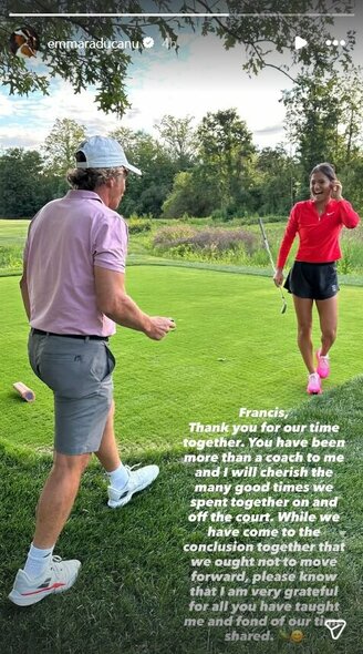 Socialiniame tinkle „Instagram” E. Raducanu paskelbė jautrų atsisveikinimo pranešimą: „Francisco, dėkoju už visą kartu praleistą laiką. Buvai man kur kas daugiau nei vien treneris, ir visuomet branginsiu nuostabias akimirkas, patirtas aikštyne. Nors abu sutarėme, kad mūsų keliai turi išsiskirti, esu be galo dėkinga už suteiktas pamokas ir šiltai prisiminsiu mūsų bendravimą.”